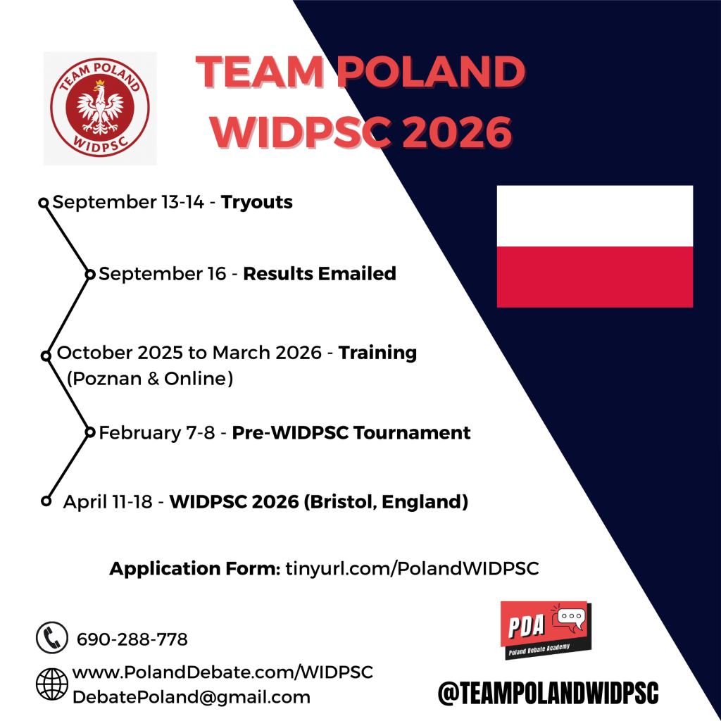 We are so delighted to announce that PDA is sending the first ever Polish team to participate in the 2026 World Individual Debating & Public Speaking Championship (WIDPSC) in England! Selections for the first ever Team Poland WIDPSC will be conducted in September. Students must be high school students and they may attend the interview in Poznan or online. This is a public speaking team but there are individual debates which students must compete in at the World Championship. WIDPSC participants must compete in 3 public speaking events and in individual debate.